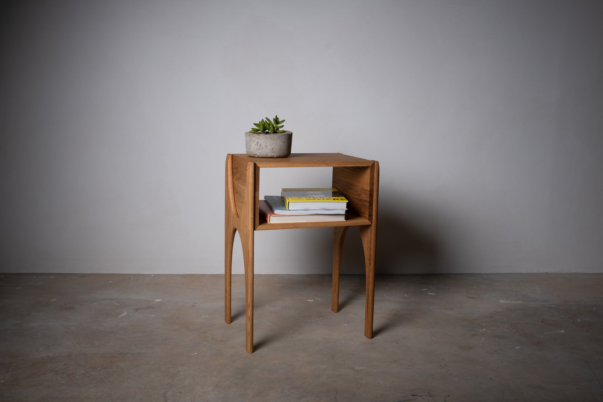 The Doxa is handcrafted from White Oak, featuring an open cubby for convenient storage. Pair it with our Poiema Accent Chair for a stunning set, or use it alongside any accent chair or couch to elevate your living room, office, or lounge space. Each piece can be custom-built to your specifications, with options for alternative wood species, finishes, and dimensions, allowing you to create a unique piece that perfectly fits your space.